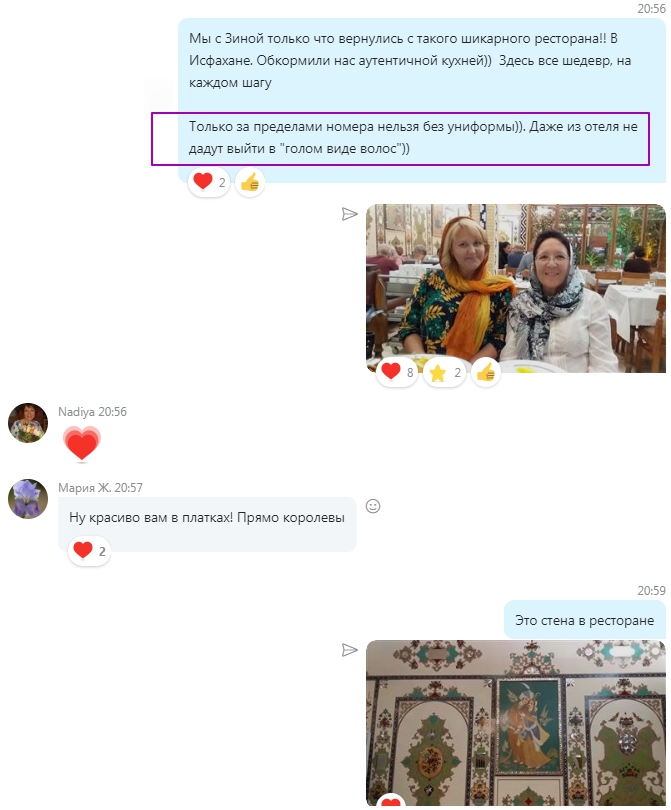 Здесь в Иране я в ярких пестрых нарядах, которые скорее не к иранской местности, а узбекской, и т.д.